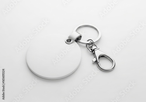 keychain, blank, white, round, circular, metal, silver, clasp, ring, accessory, keyring, holder, attachment, design, template, copy space, customizable, personalization, gift, souvenir, promotional, advertising, branding, logotype, decoration, simple, minimalist, clean, isolated, studio shot, product, object, background, white background, closeup, detail, modern, fashion, style