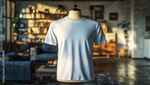 Blank white t shirt mockup on mannequin in stylish home studio with warm sunlight and blurred