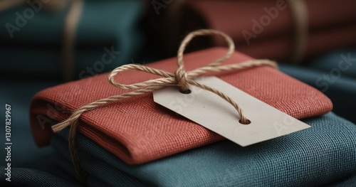 Blank white tag attached to a bundle of folded fabrics, providing a space for labeling items in a neat arrangement for easy identification