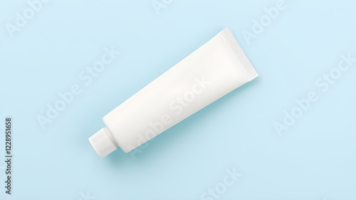 Blank white tube mock up of ointment on light blue background, top view. Space for text. Generative AI