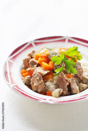 calf, meat, french, gastronomy, winter, rice, mushroom, carrot