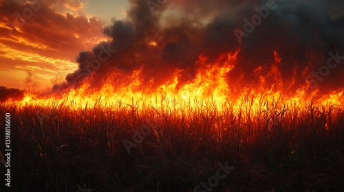 field, grass, fire, flames, sunset, smoke, burning, landscape, nature, sky, heat, wild, dramatic, blaze, environment, illuminated, colours, destruction, agriculture, vegetation, scenery, warmth, evening, rural, chaos, wildfire, energy, intensity, summer, orange, yellow, contrast, land, wildlife, safety, beauty, horizon, elemental, force, life, seasonal, change, atmospheric, condition, setting, agricultural