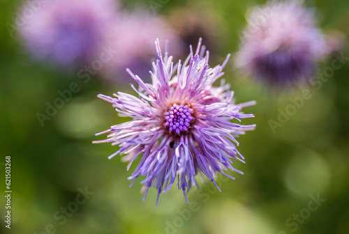Blessed milk thistle flowers, close up. Silybum marianum herbal remedy plant, Saint Mary's Thistle, Marian Scotch thistle, Mary Thistle, Cardus marianus blossom