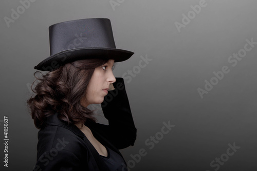 woman, pretty, beauty, boy, attractive, fashion, black, pretty, blank, look, eye, future, vision, model, cabaret, theatre, cylinder, hat, background, grey, curl, hair, profile, nose, vision, baroque, drape, stage, concept, dominance, mistress, lifestyle, nobody, portrait, femininity, feminine, female, decorating, art, gallery, artist, historic, elegance