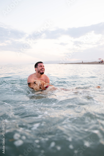 guide dog, beach, companionship, blind, man, guide, dog, ocean, swim, inclusion, joy, lifestyle, sunny, day, water, freedom, friendship, trust, loyal, happiness, disability, support, wave, sand, leisure, vacation, relaxation, bond, togetherness, resilience, independence, playful, active, outdoors, serene, landscape, calmness, liberation, oneness, empathy, understanding, partnership, adventure, fun