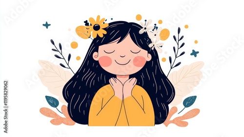 Blissful young woman surrounded by blooming flowers and golden sunlight, depicted in a stylized illustration blending natural beauty with ethereal serenity and joyful emotion