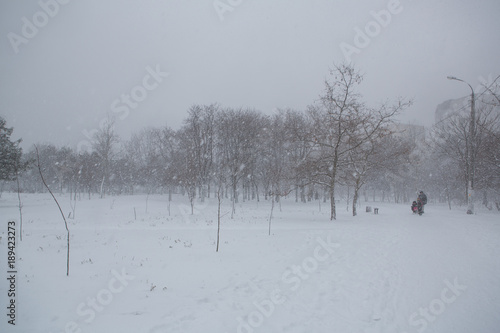 Blizzard. snowstorm in forest. strong snowstorm in park. snow-covered trees.