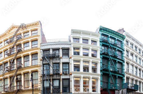 Block of colorful old historic buildings in the SoHo neighborhood in New York City isolated on empty white sky background