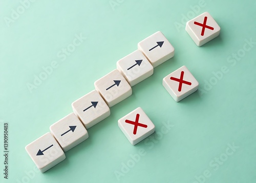 Blocks with arrows in a line and blocks with x marks on a light green background in a close up view