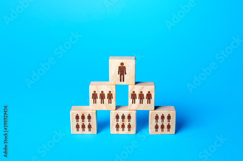 Blocks with people are built in a triangle. Conformism system leader - subordinate. Society model, company organization. Personnel management. Hiring employees. Subordination, distribution of duties