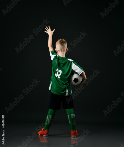Blond smiling boy child in sports green and white clothes standing holding soccer ball and raised hand up over dark background. Trendy sports active children fashion concept