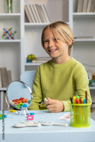 Blonde boy at the table in a speech therapist office looking happy and contented