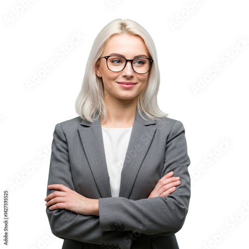 Blonde businesswoman in gray suit and glasses standing with arms folded for corporate, professionalism, and confidence