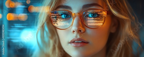 Blonde Caucasian female data analyst in IT, with dynamic data flow graphics, showcasing a professional business look, clear space for text