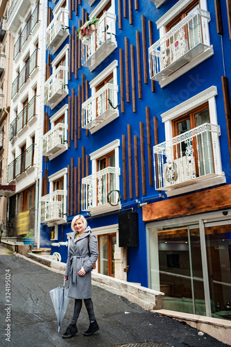 background, blond, female, girl, hair, looking, portrait, rain, smile, weather, woman, adult, autumn, blue background, cute, day, emotion, face, happy, horizontal, joy, 1, outdoors, precipitation, rainstorm, spring, wet, street, fashion, pretty, fall, city, urban, young, eye, people, contemporary, jacket, casual attire, foulard, winter, model, umbrella