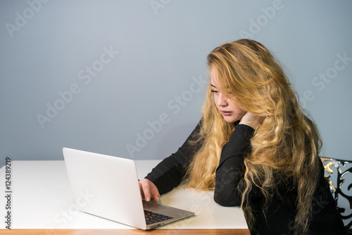 blonde with long hair at the computer