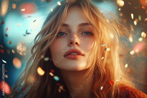 Blonde woman amidst colorful confetti. Perfect for celebration, joy, and beauty themes.