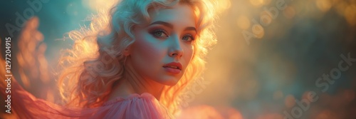 woman, blond, portrait, beauty, girl, face, hair, eye, model, make-up, artistic, soft, glamour, dreamy, serene, glow, illuminated, pastel, aethereal, romantic, elegant, fairy tale, nostalgic, sensual, delicate, curl, vintage, style, pink, fabric, shoulder, expression, nostalgia, fantasy, radiant, graceful, glowing, dreamlike, aurora