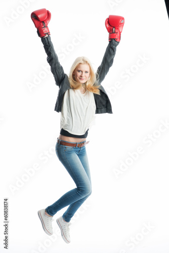girl, hooray, blond, blond, blond, blond, youth, woman, boxing gloves, competition, victory, winner, winner, woman, force, strength, fun, elation, assertiveness, punch, weight training, box, security, fitness, contest, defense, defend, train, contemplate, young