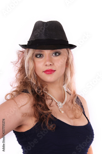 hat, woman, young, beauty, pretty, fashion, portrait, black, white, face, model, isolated, person, people, hair, glamour, smile, 1, pretty, eye, studio, style, sensuality, smiling