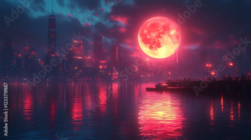 moon, city, night, red, blood, futuristic, waterfront, skyline, urban, landscape, dark, sky, building, water, atmosphere, glow, light, fantasy, science, fiction, digital, art, illustration, abstract, mystic, dream, space, cosmic, evening, scene, background, dramatic, mysterious, magical, enchantment, silhouette, view, texture, colours, design, image, artwork