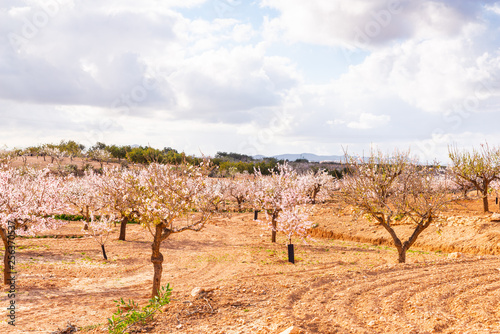 Blooming almond trees with pink and white flowers in a Spanish orchard