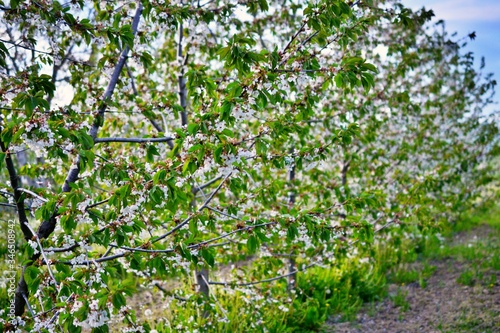 cherry, spring, plant, flower, tree, leaf, field, blossom, leaf, tree branch, white, garden, bloom, flower, sky, apple, grass, summer, season, bush, agriculture, beauty, blue, blooming