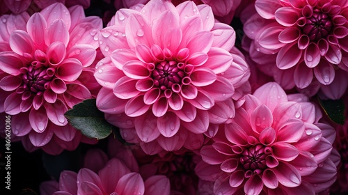 Blooming Dahlia flowers composition. Close-up of vibrant pink dahlia flowers with water droplets on petals. Filled on full screen.