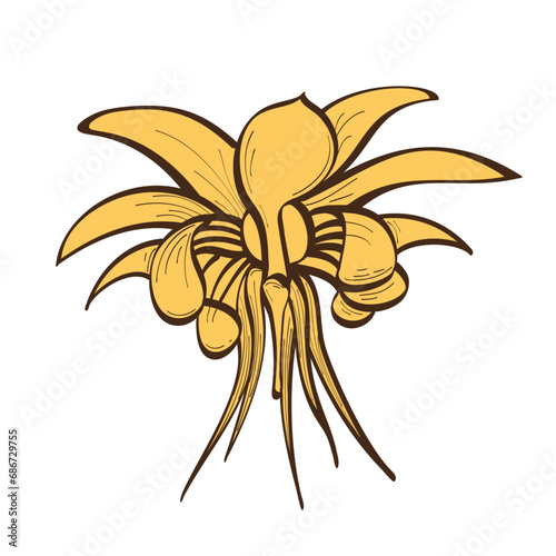Blooming flower of the cocoa bean plant drawn in black outline color. Flat doodle style. Vector illustration.