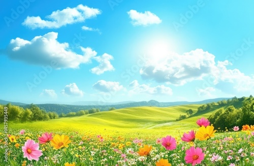 Blooming Meadow, Vibrant Cosmos Flowers, Green Hills, Sunny Sky, and Cumulus Clouds