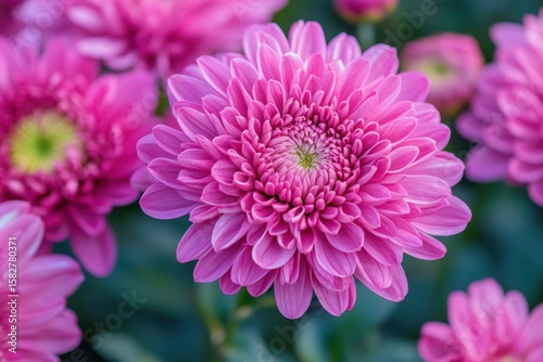 Blooming pink chrysanthemum with intricate petal patterns, garden scene
