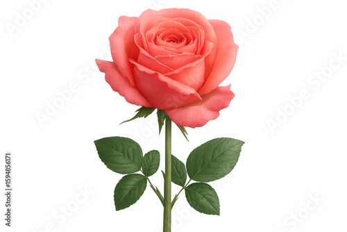 Blooming pink rose adorned with vibrant green leaves, elegantly resting on its stem, set against a transparent background