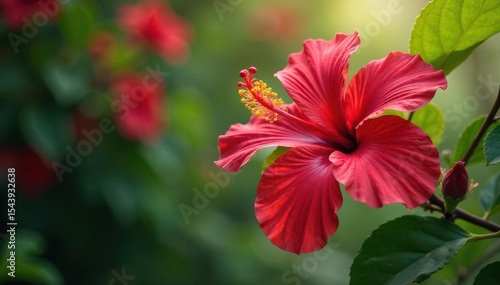 Blooming red hibiscus flowers on the tree branches, nature, tree, foliage