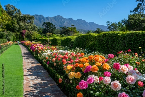 Blooming roses line a tranquil garden path in stellenbosch, south africa