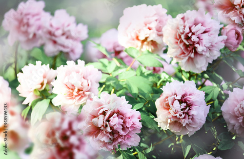Blooming tender pink peonies flowers. Tree peonies. Very soft selective focus. Vintage