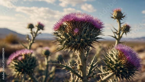 thistle, blooming, flowering, growing, spiky, prickly, pink, purple, green, desert, arid, dry, landscape, outdoors, day, sky, cloud, open, space, vegetation, plant, flora, botany, nature, environment, wild, countryside, rural, background, seasonal, field, hill, mountain, summer, spring, closeup, macro, scenic, tranquil, botanical