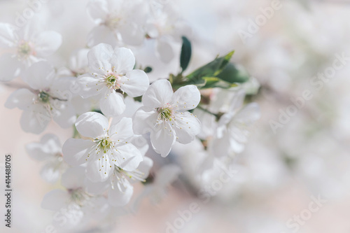 Blooming tree branch close up in a sunny day. Spring nature concept. Selective focus