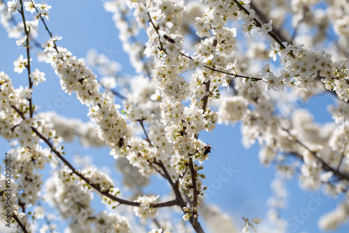 Blooming tree branches against clear blue sky. Spring, nature, freshness and calmness.