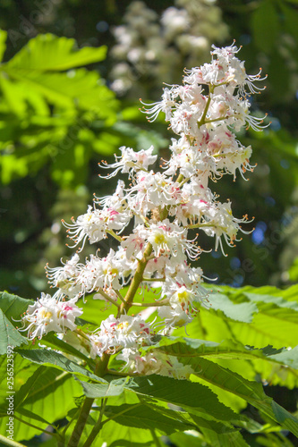 Blossoming chestnut tree in spring. closeup white flower and Green leaves on sunshine. floral concept. vertical image.