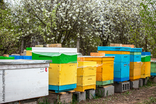Blossoming garden with apiary. Bees spring under the flowering trees of apple trees. Red tulips on the background of hives.