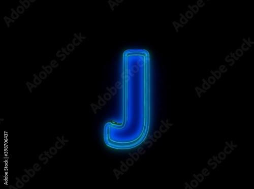 Blue - green neon light glow glass made crystal font - letter J isolated on black dark, 3D illustration of symbols