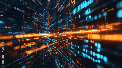 blue and orange rays of light in the form of digital information