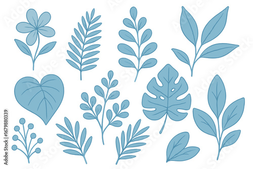 leaf, plant, flower, botanical, set, vector, illustration, floral, foliage, blue, nature, design, element, collection, cartoon, doodle, monstera, fern, tree branch, hand-drawn, clip art, graphic, isolated, icon, art, drawing, simple, minimalist, tropical, summer, spring, decor, decoration, ornament, natural, organic, eco, elegant, modern, blossom, twig, stem, vegetation, decorative