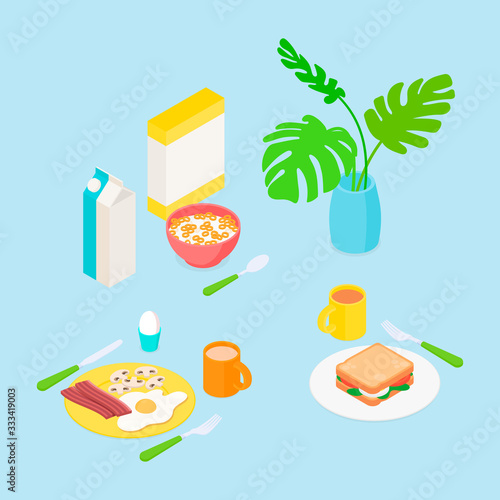 isometric, vector, illustration, graphic, isolated, interior, infographic, breakfast, healthy, kitchen, background, decoration, food, set, eating, lifestyle, cooking, preparing, home, cereal, hobby, homemade, milk, hot drink, mug, fried, egg, boiled, cutlery, sandwich, dish, tableware, organic, cup, bacon, mushroom, bowl, brunch, orange, delicious, lettuce, flower, eatery, dinner, epicure