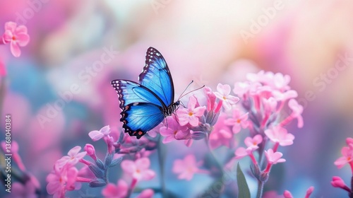 Blue Butterfly Resting on Pink Flowers in a Soft Light Garden