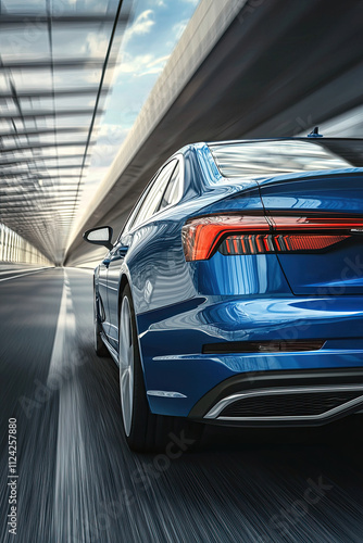 Blue car driving on the highway, motion blur, rear view. luxury sports sedan concept model