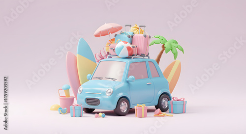 car, pack, cartoon, cute, playful, beach, travel, baggage, beach ball, umbrella, surfboard, palm tree, gift, summer, vacation, trip, holiday, adventure, transportation, road trip, leisure, relaxation, tour tourism, get-away, destination, sun, sand, sea, ocean, coast, recreation