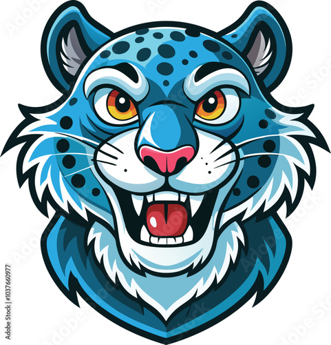 blue, cartoon, leopard, mascot, head, design, illustration, black, spot, white, fur, face, pink, nose, yellow, eye, open, mouth, teeth, red, tongue, animal, wildlife, wildcat, felino, predator, cute, funny, character, graphic, art, vector, digital, drawing, painting, artwork, icon, logotype, brand, sport, team, spirit, identity, symbol