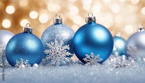Blue christmas balls with snowflakes on bokeh background