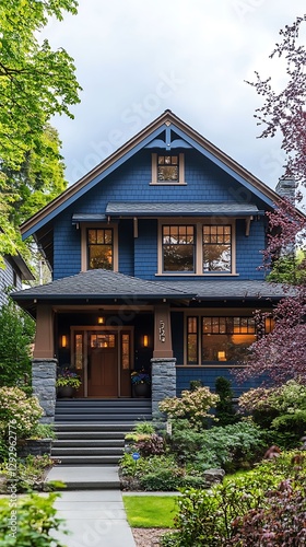 house, home, blue, craftsman, architecture, style, exterior, residential, property, real, estate, garden, landscaping, urban, neighbourhood, street, suppressing, attracted, design, renovation, remodel, window, door, siding, roof, porch, step, paseo, plant, shrub, tree, foliage, front, facades, view, image, picture, photo, dwelling, building, structure, location